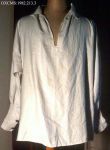 'a white linen, shirt style smock, made and used between 1800 and 1899. The unshaped body is gathered into the collar which is edged with a wavy line of single featherstitch between parallel lines of double featherstitch, with sprigs of featherstitch, in curves. There is a zigzag of single featherstitch along the shoulders and smocking at the top of the arms and above the cuffs. There is an embroidered featherstitch heart at the base of the front opening.'